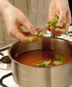 Pulite bene le foglie di basilico e aggiungetele alla salsa; unite anche 2-3 grossi pizzichi di sale e un cucchiaino di zucchero e proseguite la cottura per altri 5 minuti.