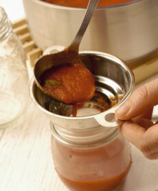 Versate la salsa bollente nei vasi senza arrivare all'orlo e, prima di sigillare i barattoli, unite un filo di olio che servirà per tenere lontani eventuali microbi. Procedete quindi alla sterilizzazione, lasciando sobbollire per circa 1 ora. Per verificare l'avvenuta sterilizzazione, controllate il coperchio: se è a capsula deve avere una leggera depressione in superficie; se è a molla, aprendo il gancio deve rimanere chiuso.