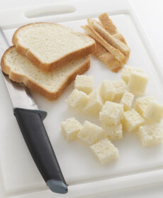 Private le fette di pancarré della crosta, tagliatelo a dadini piccoli e regolari e tostateli in una padella antiaderente fino a doratura.