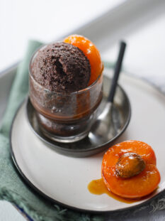 Sorbetto al cioccolato e cardamomo con albicocche caramellate