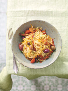 Pasta di farro con cipollotti e pesto di noci all’arancia