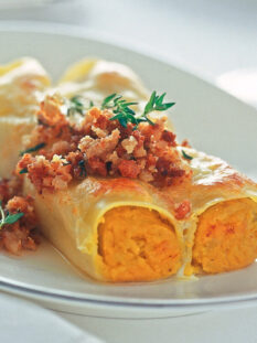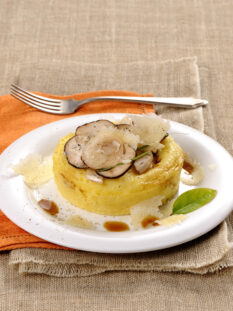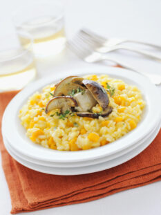Garganelli di segale con finferli, fonduta di Roquefort e briciole