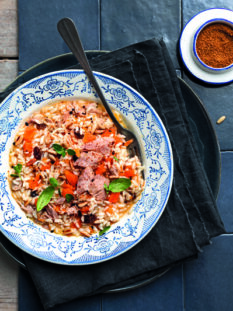 Insalata di zucchine novelle, avocado e bottarga con pesto rosso