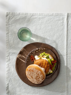 Burger con pesche grigliate, rucola e cipolla marinata in rosso