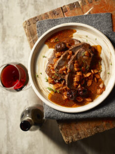 Costatine di cervo, patata schiacciata al timo e salsa all’Amarone