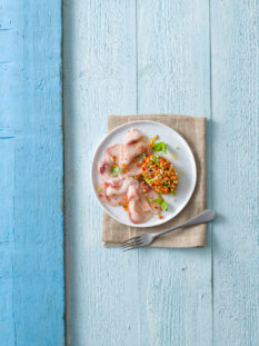Fettuccine con scarola in agrodolce e carpaccino di scampi