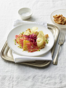 Carpaccio di agrumi e caciocavallo con pistacchi e cipolle rosse