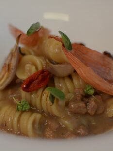 Pasta al ragù di manzo al coltello, riduzione di vino e scalogno confit