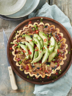 Pasta di farro con cipollotti e pesto di noci all’arancia