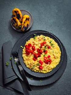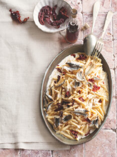 Maccheroni con stracciatella, alici e peperoni cruschi