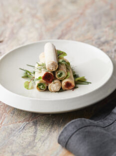 Insalata di pollo con pesto di fave e latte all’aglio nero