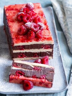 Dolce di mascarpone e cioccolato con meringhette rosa