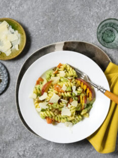 Insalata di pasta con Grana Padano, crema di pistacchi e pesche grigliate