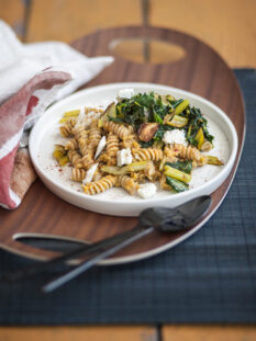 Fusilli con pesto di zucchine, briciole croccanti e olive