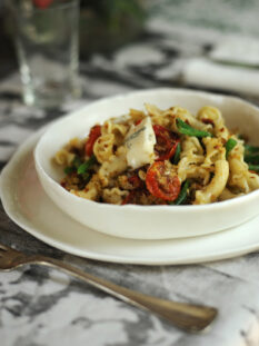 Gigli con pomodorini abbrustoliti, fagiolini e gorgonzola di capra