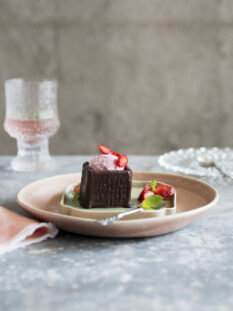 Agnello con pistacchi, fondo al cioccolato e patate sfogliate