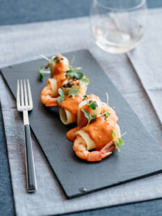 Trionfo di gamberi alla catalana con salsa di senape e pomodoro secco