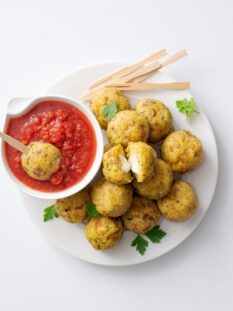 Quiche di ciliegini e polpettine di zucchine alla rucola
