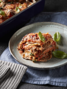 Parmigiana di melanzane e gamberetti impanati in friggitrice ad aria