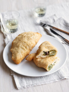 Pizza fritta con scarola, provola, olive di Gaeta e acciughe
