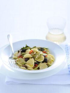 Orecchiette integrali con crema di scarola, olive e pistacchi