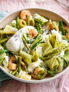 Pasta di farro con cipollotti e pesto di noci all'arancia