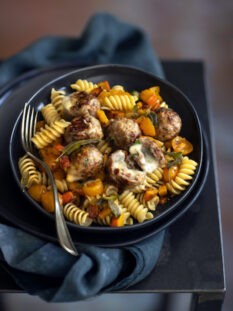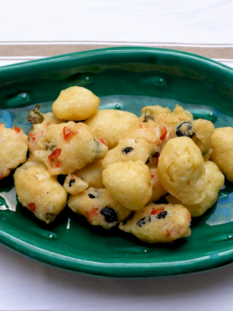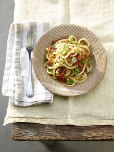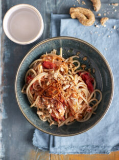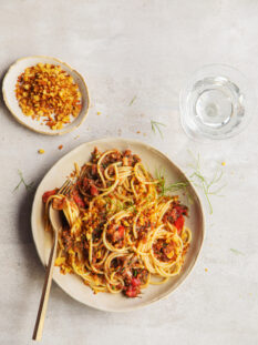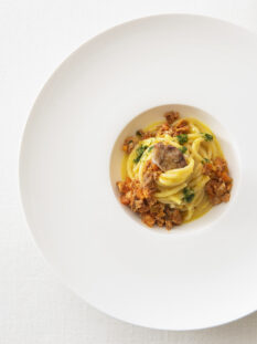 Pappardelle con moscardini al vino rosso, pere, briciole di pane e pecorino