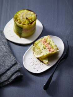 Involtini di salmerino e verza su timballo di cavolo romanesco e patate di montagna