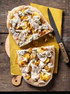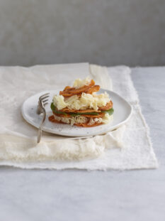 Patata morbida all’olio, tartare di salmone affumicato con le sue uova e basilico