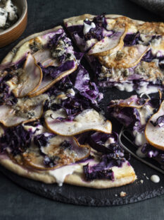 Pizza non lievitata al cavolo rosso, panna acida, pere e Roquefort