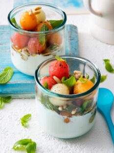 Bicchierini di burrata con anguria, melone e pinoli tostati