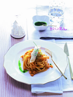 Linguine con ragù di ricciola, pomodorini, arancia e polvere di capperi fritti