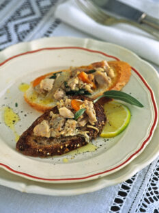 Coniglio in tegame con puntarelle e fave alla maggiorana
