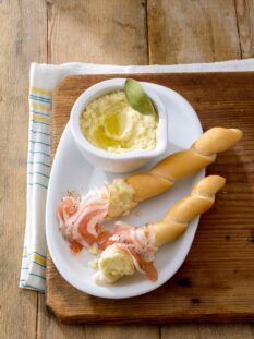 Grustin con crema di parmigiano e pancetta al pepe