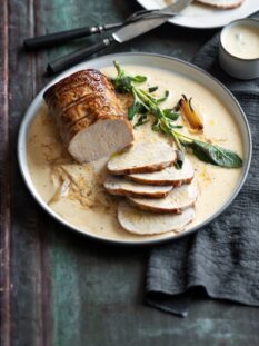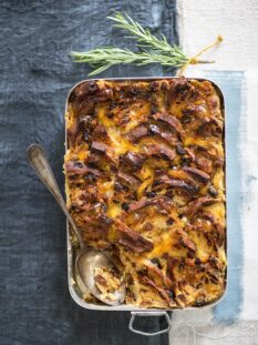 Spaghettoni alla crema di cipolla, olive e rosmarino