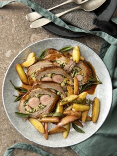 Costatine di cervo, patata schiacciata al timo e salsa all’Amarone