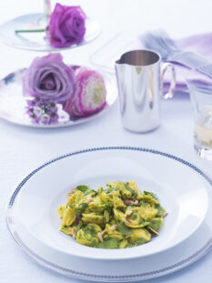 Frutti rossi con gelato al miele e tuile ai pistacchi