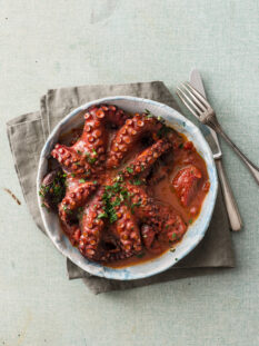 Spiedini di polpo, cipolle rosse marinate e pomodori secchi