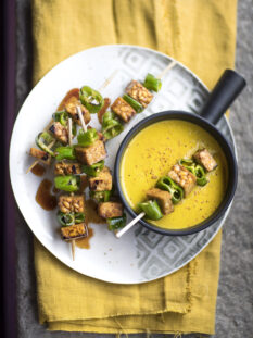 Crema Parmentier con spiedini di salsiccia e salvia