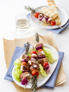 Spiedini di pane e agnello con insalata di melanzane
