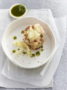 Tartare di salsiccia di Bra su patate e fagiolini al pesto