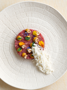 Bruschetta con tartare di vitellone, cipollotto, nocciole tostate e maionese