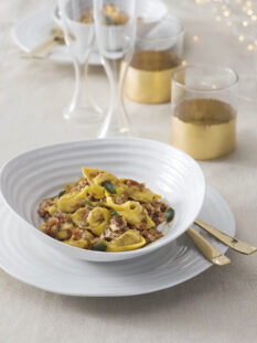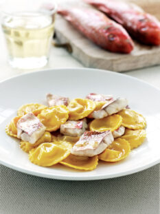 Tortellino bugiardo con cozze, emulsione alla bisque e panna acida