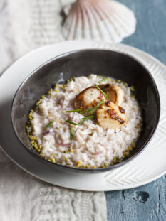 Risotto al vermouth, capesante e pistacchi, al profumo di limone e vaniglia