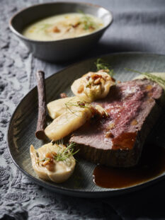 Arrosto di sottofesa marinato alla liquirizia con finocchi
