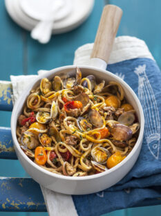 Spaghetti al nero di seppia con ragù di ricciola alla vernaccia