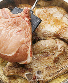 Scalda in una padella 30 g di burro e 2 cucchiai di olio; adagiavi le braciole e falle cuocere per 6-7 minuti per parte, poi toglile dalla padella.