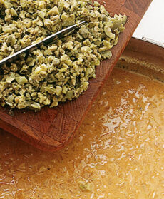 Trita finemente un cucchiaio di capperi con 50 g di olive verdi snocciolate e 2 cetriolini sott’aceto e mescola il composto con un cucchiaio di senape dolce.