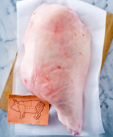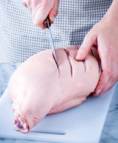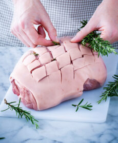 Il cosciotto di un maialino da latte si può cuocere anche intero, al forno, dopo aver inciso la cotenna...