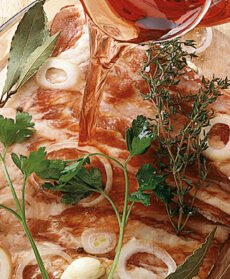 Ottime le classiche erbe aromatiche (alloro, timo, prezzemolo) a cui si può aggiungere uno spicchio di aglio pestato, qualche anello di cipolla, granelli di pepe, sale.